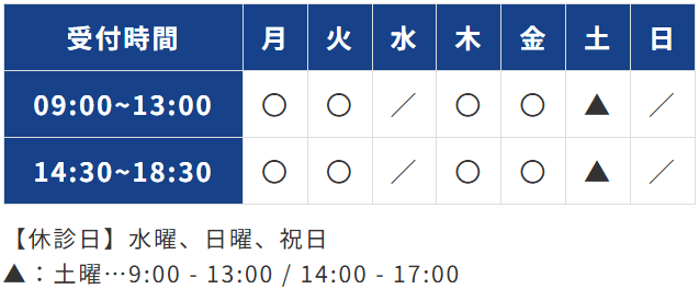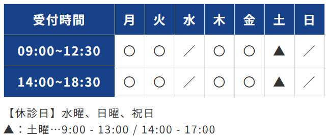 受付時間 月・火・木・金 9:00-18:30土 9:00-13:00/14:00-17:00